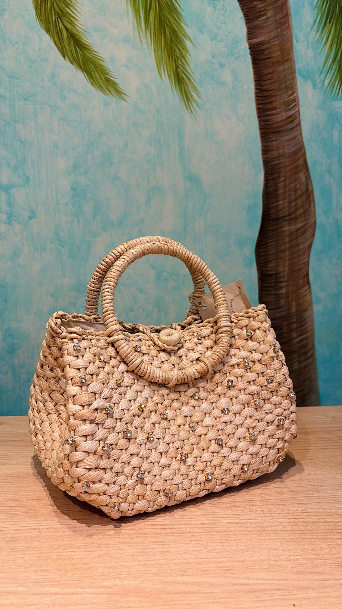 Bolsa inteiramente artesanal, feita em palha natural , tingida manualmente e com aplicação bordada em...