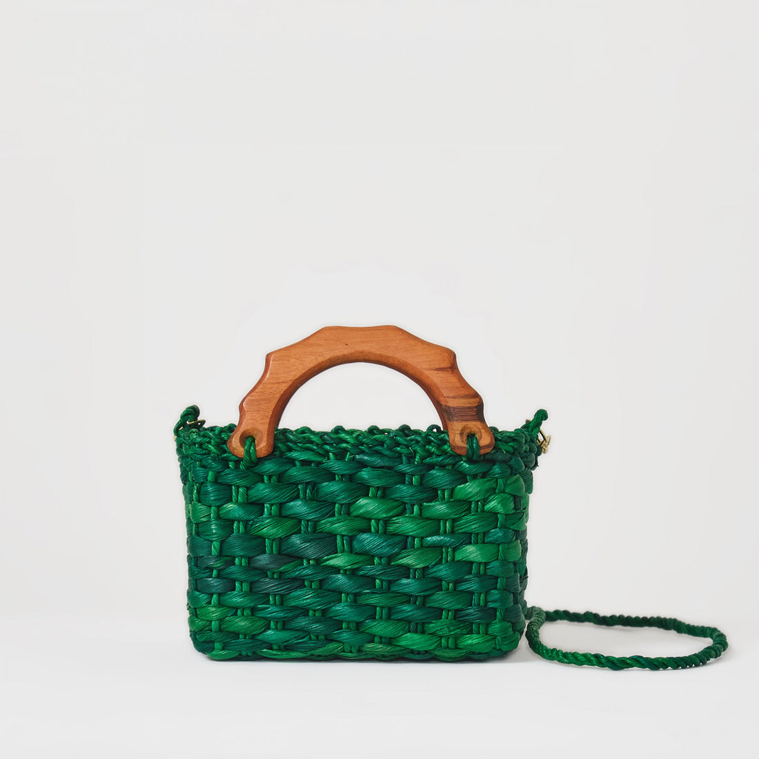 Alça de mão em madeira e a alça de ombro em palha.